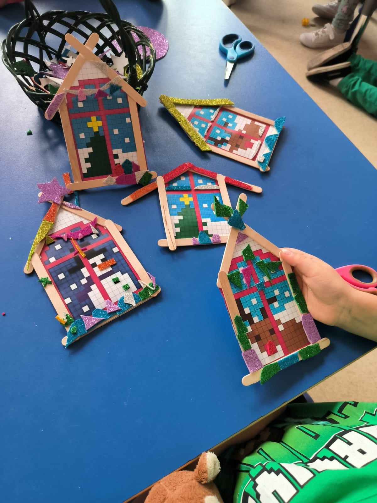W świetlicy szkolnej poczuliśmy już świąteczny klimat i i rozpoczęliśmy wykonywanie prac plastycznych na zbliżający się kiermasz świąteczny. Przedstawiamy nasze kolorowe choinki i drewniane domki z patyczków.